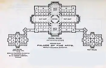 The Palace of Fine Arts was built for the 1893 World's Columbian Exposition and was designed by Charles B. Atwood for D. H. Burnham & Co. During the fair, the palace displayed paintings, prints, drawing, sculpture, and metal work from around the world.[2]