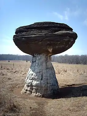 Mushroom Rock is Kansas's smallest state park.[2] As well as being "one of the 8 wonders of Kansas Geography."[3] Mushroom Rock State Park is managed by Kanopolis State Park,[1] under regulation of Kansas Department of Wildlife, Parks and Tourism. The rock used to serve as meeting places for pioneers and Native Americans.[1]