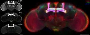 The mushroom bodies or corpora pedunculata are a pair of structures in the brain of insects, other arthropods, and some annelids (notably the ragworm Platynereis dumerilii).[2] They are known to play a role in olfactory learning and memory. In most insects, the mushroom bodies and the lateral horn are the two higher brain regions that receive olfactory information from the antennal lobe via projection neurons.[3] They were first identified and described by French biologist Félix Dujardin in 1850.[4][5]