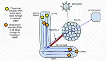 Protein kinase A (PKA) has been found to play an important role in learning and memory in Drosophila.[32] When calcium enters a cell and binds with calmodulin, it stimulates adenylate cyclase (AC), which is encoded by the rutabaga gene (rut).[33] This AC activation increases the concentration of cAMP, which activates PKA.[33] When dopamine, an aversive olfactory stimulant, is applied it activates PKA specifically in the vertical mushroom body lobes.[33] This spatial specificity is regulated by the dunce (dnc) PDE, a cAMP-specific phosphodiesterase. If the dunce gene is abolished, as found in the dnc mutant, the spatial specificity is not maintained. In contrast, an appetitive stimulation created by an octopamine application increases PKA in all lobes.[33] In the rut mutant, a genotype in which the rutabaga is abolished, the responses to both dopamine and octopamine were greatly reduced and close to experimental noise.