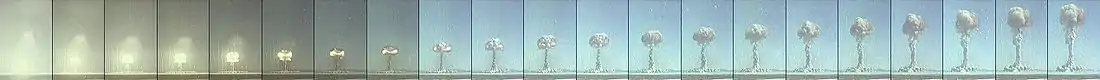 The intense radiation in the first seconds after the blast may cause an observable aura of fluorescence, the blue-violet-purple glow of ionized oxygen and nitrogen out to a significant distance from the fireball, surrounding the head of the forming mushroom cloud.[20][21][22] This light is most easily visible at night or under conditions of weak daylight.[6] The brightness of the glow decreases rapidly with elapsed time since the detonation, becoming only barely visible after a few tens of seconds.[23]