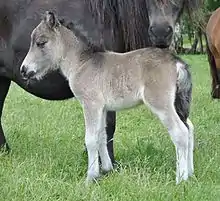On a chestnut base coat the horse is born a pale beige with sometimes a greyish or pinkish tint and often keeps that color when it becomes an adult, but some turn darker when an adult.[2]