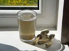 Mushroom tea is an infusion of mushrooms in water, made by using edible/medicinal mushrooms (such as lingzhi mushroom) or psychedelic mushrooms (such as Psilocybe cubensis). The active ingredient in psychedelic mushrooms is psilocybin, while the active ingredients in medicinal mushrooms are thought to be beta-glucans.