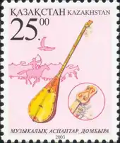The most popular traditional instruments are string instruments. First of them is the dombra (домбыра), the most popular and the oldest Kazakh music instrument. Some argue that nomads have used similar two-string instruments more than two thousand years ago.[1] The dombra is a long-necked lute with two strings tuned in the interval of a fourth or sometimes a fifth. The strings are plucked or strummed by the right hand without a plectrum.