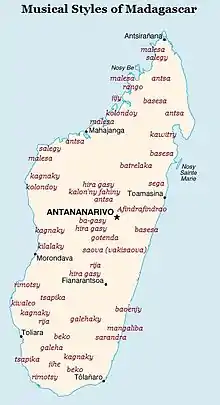 Malagasy music is highly melodic and distinguishes itself from many traditions of mainland Africa by the predominance of chordophone relative to percussion instruments.[4] Musical instruments and vocal styles found in Madagascar represent a blend of widespread commonalities and highly localized traditions. A common vocal style among the Merina and Betsileo of the Highlands, for instance, does not preclude differences in the prevalence of particular instrument types (the valiha among the Merina, and the marovany and kabosy among the Betsileo). Similarly, the practice of tromba (entering a trance state, typically induced by music) is present on both the western and eastern coasts of the island but the vocal styles or instruments used in the ceremony will vary regionally.[5] Music in Madagascar tends toward major keys and diatonic scales,[6] although coastal music makes frequent use of minor keys, most likely due to early Arab influences at coastal ports of call.[7] Malagasy music has served a wide range of social, spiritual and mundane functions across the centuries.