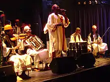 After a military coup in 1989, the imposition of sharia law by an Islamist government brought about the closing of music halls and outdoor concerts, as well as many other restrictions for musicians and their audiences. Many of the country's most prominent musicians or writers were barred from public life, and in some cases even imprisoned. Others, like Mohammed al Amin, whose personal style of playing the oud influenced other musicians,[55] and Mohammed Wardi, took exile in Cairo or other places.[56] Traditional music suffered too, with East African zār ceremonies, where women conjure and exorcise evil spirits through music and dance, interrupted and deemed as 'pagan'.[57] In this context of ceremonies for women, the singer Setona, born in Kordofan and raised in Khartoum, before she emigrated to Cairo in 1989, published two albums, called Tariq Sudan and Queen of Hena, with some of her songs related to henna ceremonies.[58] Another singer and composer of popular songs, who appeared on Sudan's musical scene in the 1990s, is Nada Al-Qalaa. Through her songs, video clips and media interviews, Al-Qalaa has presented conservative views on social life and gender roles. This and the support by wealthy patrons in Sudan and Nigeria has caused criticism, accusing her of being close to the military government. On the other hand, her music and public appearance has earned her a wide following for more than twenty years.[59]