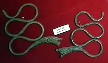 | Kaalwaal khuruwaa or Kaankara | ? or खाँकर | Hollow metal anklets with iron balls inside, make noise when moving feet, worn by female dancers. Tube is about 12 cm in diameter.[16] | Mech people, Koche | Jhapa District | ![]() Indian made anklet. |