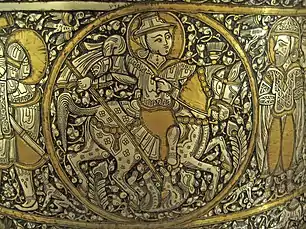 Islamic metalwork includes some three-dimensional animal figures, such as fountainheads or aquamaniles, but only one significant enamelled object of Byzantine cloisonné technique is known.[47] The Pisa Griffin is the largest surviving bronze animal, probably from 11th century al-Andaluz. More common objects with elaborate decoration include massive low candlesticks and lamp-stands, lantern lights, bowls, dishes, basins, buckets (these probably for the bath),[48] and ewers, as well as caskets, pen-cases and plaques. Ewers and basins were brought for hand-washing before and after each meal, and so are often lavishly treated display pieces. A typical 13th century ewer from Khorasan is decorated with foliage, animals and the Signs of the Zodiac in silver and copper, and carries a blessing.[49] Specialized objects include knives, arms and armour (always of high interest to the elite) and scientific instruments such as astrolabes, as well as jewellery. Decoration is typically densely packed and very often includes arabesques and calligraphy, sometimes naming an owner and giving a date.[50]