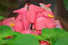 Mussaenda erythrophylla, commonly known as Ashanti blood, red flag bush and tropical dogwood, is an evergreen West African shrub. The bracts of the shrub may have different shades, including red, rose, white, pale pink or some mixtures. Mussaenda erythrophylla grows best in warmly temperate or subtropical areas and is semideciduous in cooler parts.[1] In its natural habitat the shrub may scramble up to 10 m (33 ft), but is kept compact under cultivation.[1] The star-like flowers of the shrub are 10 mm (0.39 in) in diameter and have a single, modified sepal.