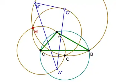 Specifically, let be a triangle, and , , and its vertices. Let , , and be the vertices of the reflection triangle , obtained by mirroring each vertex of across the opposite side.[1] Let be the circumcenter of . Consider the three circles , , and defined by the points , , and , respectively. The theorem says that these three Musselman circles meet in a point , that is the inverse with respect to the circumcenter of of the isogonal conjugate or the nine-point center of .[2]