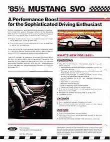 The Mustang SVO (Mustang Special Vehicle Operations[2]) is a limited-production version of the third generation Ford Mustang sold from 1984 to 1986, with fewer than 10,000 built. Although it departed both physically and mechanically from any prior version of the Mustang, it held the same spot within the lineup, both in terms of performance over "lesser" variants and in prestige, as had variants such as the Shelby-tuned and "BOSS" Mustangs of the 1960s and 1970s.