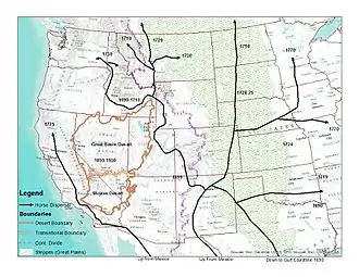From the Pueblo people, horses were traded to the Apache, Navajo and Utes. The Comanche acquired horses and provided them to the Shoshone.[43] The Eastern Shoshone and Southern Utes became traders who distributed horses and horse culture from New Mexico to the northern plains.[44] West of the Continental Divide, horses distribution moved north quite rapidly along the western slopes of the Rocky Mountains, skirting desert regions[37] such as the Great Basin and the western Colorado Plateau.[44][lower-alpha 7] Horses reached what today is southern Idaho by 1690.[34] The Northern Shoshone people in the Snake River valley had horses in 1700.[45][lower-alpha 8] By 1730, they reached the Columbia Basin and were east of the Continental divide in the northern Great Plains.[34] The Blackfeet people of Alberta had horses by 1750.[46] The Nez Perce people in particular became master horse breeders, and developed one of the first distinctly American breeds, the Appaloosa. Most other tribes did not practice extensive amounts of selective breeding, though they sought out desirable horses through acquisition and quickly culled those with undesirable traits. By 1769, most Plain Indians had horses.[45][47]