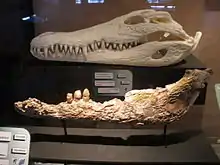 | Holotype jaw of a Musturzabalsuchus (bottom) next to a skull of a Crocodylus (top) | |