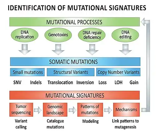 Mutational signatures are characteristic combinations of mutation types arising from specific mutagenesis processes such as DNA replication infidelity, exogenous and endogenous genotoxin exposures, defective DNA repair pathways, and DNA enzymatic editing.[1]