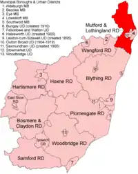 Mutford and Lothingland Rural District was a rural district within the administrative county of East Suffolk between 1894 and 1934. It was created out of the earlier Mutford and Lothingland rural sanitary district.[1] It was named after the historic hundred of Mutford and Lothingland, whose boundaries it closely matched.