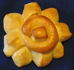 The Mutschel is a traditional star-shaped bread from Reutlingen, Germany. The pastry, and the corresponding Mutscheltag (Mutschel Day), have probably existed since the 13th century. Mutscheln are roughly star-shaped and come in various sizes: usually approximately six inches in diameter, but bakeries often offer breads three or more feet in diameter. The most common Mutschel is made of wheat, yeast, a small amount of fat like lard or butter and eggs. They are sometimes made in sweet varieties.