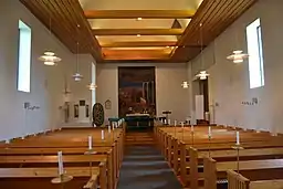 The church was comprehensively restored in 2016 to its original design.[2] Most notably, the interior colour scheme was changed from its pre-renovation white and light wood — often associated with Aalto's minimalist style — to the original, more colourful one consisting of bright blue and red ceiling and dark grey fixtures.[5]