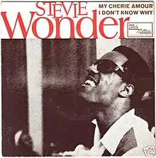 The song's instruments (with the exceptions of the horns and the strings) were recorded on November 8, 1967, at Hitsville USA. On November 17, the horns and strings were added at Golden World Records, one year before it was acquired by Motown. Wonder's vocals were added on January 15, 1968. The song was shelved for a year, first appearing as the B-side of the single "I Don't Know Why", on January 28, 1969, timed to extend the chart performance of Wonder's album For Once in My Life, from which the single came. Motown promoted "I Don't Know Why" enough that it peaked at number 39 on the pop charts in March 1969, but many radio deejays were also flipping over the record and playing "My Cherie Amour".[3] Wonder fell off the Hot 100 chart in April and most of May, but fan response to "My Cherie Amour" was building, and Tamla re-released the song for radio as the A-side. This song entered the Hot 100 on May 31 at number 70.[4] It climbed for two months, and peaked at number 4 in the first week of August.[5] At the same time, the song hit number 4 in the R&B charts.[6] Wonder also released Spanish- and Italian-language versions titled "Mi Querido Amor" and "My Cherie Amor", respectively.