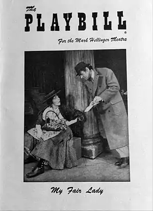 The musical premiered on Broadway March 15, 1956, at the Mark Hellinger Theatre in New York City. It transferred to the Broadhurst Theatre and then The Broadway Theatre, where it closed on September 29, 1962, after 2,717 performances, a record at the time. Moss Hart directed and Hanya Holm was choreographer. In addition to stars Rex Harrison, Julie Andrews and Stanley Holloway, the original cast included Robert Coote, Cathleen Nesbitt, John Michael King, and Reid Shelton.[16] Harrison was replaced by Edward Mulhare in November 1957 and Sally Ann Howes replaced Andrews in February 1958.[17][18] By the start of 1959, it was the biggest grossing Broadway show of all-time with a gross of $10 million.[19]