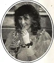 ![]() Francelia Billington between scenes enjoying a drink | |