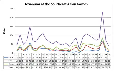 Myanmar is one of the founding six countries of the SEAP Games.At that time, the country used the name Burma and so hosted the 2nd SEAP Games in 1961.[1] Myanmar hosted 5th SEAP Games in 1969 for the second time. After that, due to political reasons, Myanmar was no longer hosted the games. However, sport delegations were sent annually. After 44 years later, Myanmar hosted again the 27th SEA Games in 2013.