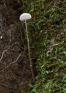 The cap is 6–12 mm (0.24–0.47 in) in diameter, and light brown with dark brown umbo. It is indistinctly grooved and fluted with a somewhat velvety texture; the margin is paler and frilled. The flesh is white beneath the umbo, fawn above the gills. The gills are adnexed, cream-coloured, some with dull pink stains. They are moderately distantly spaced apart, and covered with cystidia. The stipe is 6–8 cm (2.4–3.1 in) long by 1–2 mm (0.04–0.08 in) thick, although Australian specimens have been reported to grow as long as 20 cm (7.9 in).[5] It is cream-coloured above and brown below, with a smooth surface. The stipe is hollow, brittle, and covered densely with white hairs at the base.[2] Extending from the stipe base are numerous lengthy white rhizomorphs that can be up to 30 cm (12 in) long, and terminated by a small cap or knob. The rhizomorphs of are organized as linear strands of mycelia that are differentiated into an inner portion containing large diameter 'vessel' hyphae, and an outer cortex of narrow, thick-walled hyphae. The cap at the end of the strand bears strongly resembles the developing cap of immature fruit bodies.[6]