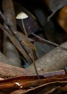Mycena cystidiosa is a saprobic fungus—meaning it obtains nutrients by breaking down decomposing plant organic matter. Although the mushrooms are usually found on fallen leaves, it also grows on wood, utilising the small branch litter common to eucalypt forests. The species may contain the enzymes necessary for decomposing lignocellulosic biomass.[7] It is found in New Zealand, southwestern Australia,[8] and Tasmania.[9] Australian mycologist Bruce Fuhrer calls it "possibly our tallest Mycena".[5] The mushrooms generally fruit from April to June.[7] In a study of post-fire succession in a Eucalyptus regnans forest, researchers found that M. cystidiosa appeared in the third of three phases of recolonization, more than seven years after the burn. Other mycenas often found in this "mature" phase include M. austrofilopes, M. austrororida, and M. interrupta.[10]