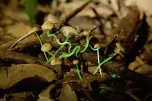 Mycena luxaeterna, commonly known as the eternal light mushroom, is a species of fungus in the family Mycenaceae. The mushrooms have parachute-shaped caps which start off darkly grayish-brown, changing to grayish-yellow or pale grayish-brown with a pale white ring at the edge when mature, and reach up to 2 cm (0.79 in) in diameter. Their thin, cylindrical, hollow, fragile stems up to 8 mm (0.31 in) in diameter are covered in a thick gel and emit a constant yellow-green bioluminescence (the caps do not glow). The gills are attached. The mushroom has a slightly radish-like smell and similar slightly bitter taste.[1]