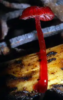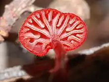 The cap is 0.5–1 mm (0.02–0.04 in) in diameter, crimson, and hemispheric in shape. The cap surface has 10–16 deep grooves that correspond to the position of the gills underneath. The flesh is thin and red. The gills have a decurrent attachment to the stem, and are distantly spaced. They are shallow, apricot in color, and occasionally forked. The edges of the gills are covered with crimson vesicles. The stem is 3–5 mm (0.12–0.20 in) by 0.1–0.5 mm (0.004–0.02 in), crimson, smooth, with a white disc of mycelium at the base.[1]