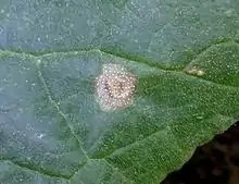 An infection from Mycosphaerella brassicicola typically presents itself on older leaves, though can be seen on younger foliage with more severe infections.[6] Although infection is most noted on the leaves of the host, spores are technically able to cause disease on any above ground portion of the plant.[3] Lesions tend to appear around 10–14 days following fungal infection. The ring lesions produced by ascospore infection will terminate at the veins of leaves, at times restricting the characteristic circular nature of the signs of Mycosphaerella brassicicola. The ring symptoms may be green-brown or grey-black in color then will progress until grey when dry, turning black when wet. The outer edge typically form a ring of chlorosis around the necrotic tissue within the lesion.[4] The rings originate as 3-5mm diameter spots that can potentially grow up to 2–3 cm. If the infection spreads far enough it may lead to premature defoliation of the host.[1]
