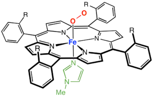 Many models of myoglobin have been synthesized as part of a broad interest in transition metal dioxygen complexes. A well known example is the picket fence porphyrin, which consists of a ferrous complex of a sterically bulky derivative of tetraphenylporphyrin.[31] In the presence of an imidazole ligand, this ferrous complex reversibly binds O2. The O2 substrate adopts a bent geometry, occupying the sixth position of the iron center. A key property of this model is the slow formation of the μ-oxo dimer, which is an inactive diferric state. In nature, such deactivation pathways are suppressed by protein matrix that prevents close approach of the Fe-porphyrin assemblies.[32]