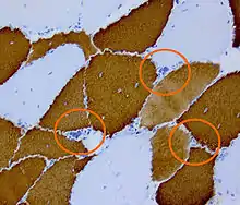 In DM2, there can be variation in the sizes of muscle fibers, although often there are no abnormalities.[5] There is selective atrophy of type 2 muscle fibers. Again, there are central nuclei and nuclear clumps.[21]