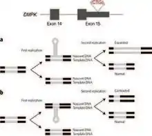 The 3' untranslated region of this gene contains 5-37 copies of a CTG trinucleotide repeat. Expansion of this unstable motif to 50-5,000 copies causes myotonic dystrophy type I, which increases in severity with increasing repeat element copy number. Repeat expansion is associated with condensation of local chromatin structure that disrupts the expression of genes in this region. As the DMPK repeat is replicated, the hairpin loop that is formed leads to repeat expansion (a) or contractions (b).[7]