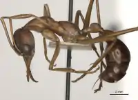 The size of worker ants varies from 19 to 23 millimetres (0.75 to 0.91 in). However, colonies contain very small workers, usually less than half the size of normal sized workers. Despite this, it is not known if M. nigriceps is polymorphic, due to little differences in morphology between the workers in comparison to Formicinae ants and Pheidole, with soldiers having enormous heads.[10] The queens are the largest, measuring around 24 to 26 millimetres (0.94 to 1.02 in), and males being around similar sizes to worker ants at 18 to 20 millimetres (0.71 to 0.79 in).[11] The head and gaster are black, and the thorax, node, and postpetiole are either red or yellowish red, while the antennae and legs are either yellow or testaceous. The mandibles and clypeus are also yellow.[11] The hair is short and yellow in colour, erect on the body and suberect on the legs. The pubescence (short, fine, soft hair) is white and abundant all over the postpetiole and gaster. The head is almost as broad as its total length, and the mandibles are longer than the head with 13 teeth present.[11]