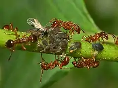 The genus contains a number of inquiline species (commensal symbionts), other Myrmica species that manage to invade the nest of their host. Subsequently, they use hormones to manipulate the host colony in such a way that eggs of the host queen develop into workers, and parasite brood into sexuals. Hence, the parasite is not able to sustain a colony of its own, but uses host resources instead.[6][7]