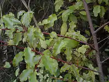 With the introduction of wild grazing mammals such as deer and goats to New Zealands native forests, there has been a widespread loss in the abundance and diversity of its understory flora, red matipo just one example of a large array of species.[14] Much like red matipo’s other attributes, it is considered a persistent species in comparison to other native plants when under the pressure of grazing mammals.[15] Through research carried out by,[15] when domesticated sheep and cattle were released into forest fragments with a high understorey flora species composition, red matipo was one of the plant species least effected, whether it be by grazing or trampling of the animals. Similar results were found by,[16] where the effects of wild grazing mammals were analysed. The Australian common brushtail possum, an invasive selective browser, also has a tendency to avoid red matipo foliage,[17] and that in a study of fruit seeds and flowers of the brushtail possum diet in New Zealand, seeds of red matipo were only found occasionally in possum faeces.[18] Avian fauna consume the fruit of red matipo, particularly native birds such as the New Zealand bellbird and tui (bird), but also introduced species such as the common blackbird.[11] These birds provide a vital role for red matipo by dispersing its seed in the process.[11]