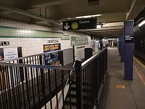 The platforms each have one same-level fare control area at their north ends.[4] The one on the Church Avenue-bound side has a bank of three turnstiles, token booth, and staircase going up to the northwest corner of Marcy and Myrtle Avenues. The one on the Queens-bound side is unstaffed, containing two High Entry/Exit turnstiles and one exit-only turnstile and a short double-wide staircase that goes up to a short landing before a standard perpendicular staircase goes up to the northeast corner of Myrtle and Marcy Avenues.[4][5] Two staircases on both platforms adjacent to fare control go down to a crossunder to allow a free transfer between directions.