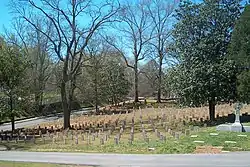 This section contains over 377 Confederate and Union soldiers including 85 Unknown Union and/or Confederate Soldiers [Ref: A History of Rome and Floyd County, Battey, pp. 622 and see also Rome and Floyd County: An Illustrated History, Sesquicentennial Edition, 1985, pp 39. The first reference states that the Unknown graves are Confederate, while the second source states that the unknown graves are Union. More definitive information is needed for clarification]. They lost their lives in the battles of the American Civil War from Rome and other places. Dr. Samuel H. Stout, the physician in charge of all the hospitals that served the Army of Tennessee, ordered that all permanently disabled patients be sent to Rome. Many are buried in this section. The buildings and churches that were used as hospitals for the fallen soldiers were spared from General William Sherman's November 1864 order of burning buildings on Broad Street. Most are still standing and are on the National Register of Historic Places. The section's graves were marked with painted wooden markers between 1863 and 1900. Sometime after 1900, their wooden markers were replaced with the present stone markers that still exist. The section is called the Confederate Section of the Cemetery, but is not limited to just soldiers from the Civil War. A few graves are those of soldiers from subsequent wars; and one woman, buried at the feet of her husband.[9]