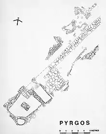Pyrgos (also Myrtos-Pyrgos; Greek: Πύργος [στο Μύρτος]) is an archaeological site of the Minoan civilization near Myrtos in the municipality of Ierapetra on the south coast of Crete. Pyrgos provides evidence of settlements along the southern Ierapetra Isthmus. This site has had a long history due to its valuable location and geography. It is located close to the Myrtos valley and has a harbor with a nearby mountain range providing its protection. The settlement includes a courtyard, many rooms, a country house and a tomb.[1]