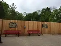 Upon stopping on the brake run, a pre-recorded audio segment is heard.[20] A security guard is heard saying, "Don't go in the shed. This is a restricted area."[20] The audio loops several times and begins to glitch and skip, eventually changing to, "Go in the shed."[20] The train proceeds slowly into the shed, which is only dimly-illuminated by flickering overhead lamps and fluorescent lights. After passing through the storage tracks, the train comes to a stop approximately where the shed crosses over the railroad once again. In this room, an assortment of saws, vines, leaves, a Coca-Cola vending machine, and other items left behind by workers are visible. A cassette player starts playing music from the 1980s until a loud screeching sound is heard. Projection screens show one of three random creatures, followed by a 90° turn to the right as the train re-enters the station.