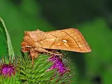 The wingspan is 30–35 mm. [4] Forewing smooth pale ochreous suffused with brown except along costa; Forewing pale fulvous suffused with darker: lines fine, brown; inner line angled on submedian fold: outer sinuate, nearly parallel to outer margin; orbicular and reniform stigmata pale, indistinct, except lower lobe of reniform, which is marked by a snowwhite spot, and is often surrounded by a grey cloud: hindwing pale rufous, darker towards termen: -suffusa Tutt is a melanic form, without any yellow tint, from North England and W. Ireland.