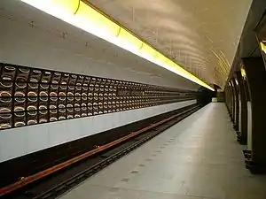 Náměstí Republiky (Czech pronunciation: [ˈnaːmɲɛsciː ˈrɛpublɪkɪ]) is a Prague Metro station on Line B in the Prague 1 district. Its two exits serve the Republic Square (Náměstí Republiky) area and the Masaryk suburban railway terminal (Praha Masarykovo nádraží) respectively. The station was opened on 2 November 1985, as part of the inaugural section of Line B between Sokolovská and Smíchovské nádraží.[2]