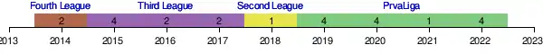 | 2018–19 | 1. SNL | 4th | 13–13–10 | Semi-finals |