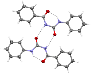 Structure of N-benzoyl-N′-phenylurea was first determined in 2010.[1] Molecules in this compound are approximately flat and exhibit high charge delocalization. Within the molecule an intramolecular N−H⋅⋅⋅O hydrogen bond is present forming pseudoaromatic 6-membered ring.[2] Additionally intermolecular N−H⋅⋅⋅O hydrogen bonds are also present combining two molecules into a centrosymmetric dimer (8-membered ring is formed).