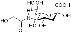N-Glycolylneuraminic acid (Neu5Gc) is a sialic acid molecule found in most non-human mammals. Humans cannot synthesize Neu5Gc because the human gene CMAH is irreversibly mutated, though it is found in other apes.[1] It is absent in human tissues because of inactivation of gene encoding CMP-N-acetylneuraminic acid hydroxylase.[2] The gene CMAH encodes for CMP-N-acetylneuraminic acid hydroxylase, which is the enzyme responsible for CMP-Neu5Gc from CMP-N-acetylneuraminic (CMP-Neu5Ac) acid.[3] This loss of CMAH is estimated to have occurred 2-3 million years ago, just before the emergence of the genus Homo.[4]