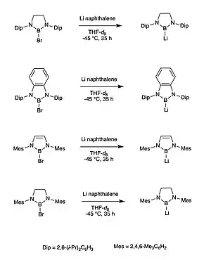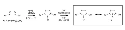 Ever since the first crystalline carbene structure was isolated by Arduengo ins 1990, tuning different properties of NHCs has been a popular area of study in main group chemistry.[4] The first NHC boryl anion was synthesized by Segawa in 2006.[1] The precursor to the complex was first synthesized by a diimine reduction by magnesium followed by a reaction with BBr3. The final complex was synthesized through cleavage on a boron-bromide bond in a bromo-diazaborole complex by lithium naphthalenide.[1] This reaction made a boryllithium complex, where the boron atom shows strong structural similarity to a free boryl anion. These similarities show that boron has the anionic -1 charge and is recognized as an isoelectronic compound to a singlet carbene.[1] The key to this synthesis was bulky R substituents on the nitrogen which prevented dimerization, something that is common in boron chemistry.[5] These bulky substituents and low temperatures provided successful isolation of the species.[6]