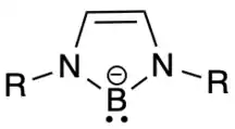 An N-heterocyclic carbene boryl anion is an isoelectronic structure of an N-heterocyclic carbene (NHC), where the carbene carbon is replaced with a boron atom that has a -1 charge.[1] NHC boryl anions have a planar geometry, and the boron atom is considered to be sp2-hybridized. They serve as extremely strong bases, as they are very nucleophilic.[1] They also have a very strong trans influence, due to the σ-donation coming from the boron atom.[2] NHC boryl anions have stronger electron-releasing character when compared to normal NHCs.[3] These characteristics make NHC boryl anions key ligands in many applications, such as polycyclic aromatic hydrocarbons, and more commonly low oxidation state main group element bonding.