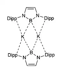 A "naked" boryl anion, in which there is no cation near the -1 boron, can be synthesized through an amide metathesis reaction. What is formed is a borylpotassium dimer, in which the K+ ions interact weakly with both the carbons on the substituents on the nitrogens and also the boron centers.[8] The K-B bond distances are >3.1 Å, which is much greater than the sum of the covalent radii. Additionally, the N-B-N bond angle is very close to the calculated gas-phase anion, leading to the conclusion that the boryl anion is as "free" as possible.[8]