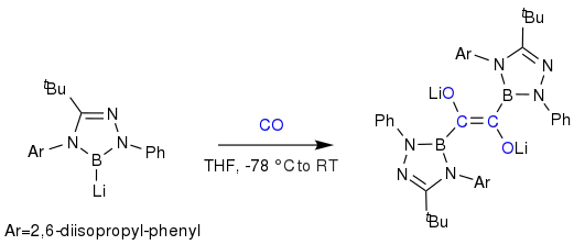 When the NHC boryl anion is in the form of a boryllithium salt, it has displayed reactivity with CO, one of the most important building blocks in the industrial field.[9] The complex goes through an insertion reaction, where the CO is inserted into the B-Li bond to make a short-lived intermediate species. This reaction shows promising applications in carbonylative coupling reactions, where CO insertion is necessary.[9]