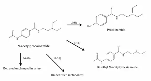 Procainamide is metabolized in the liver to acecainide by N-acetyltransferase, an enzyme that is genetically determined.[4] N-Acetyltransferase is an enzyme that catalyzes the transfer of acetyl groups from acetyl-CoA to arylamines and aromatic amines such as procainamide.[5]
